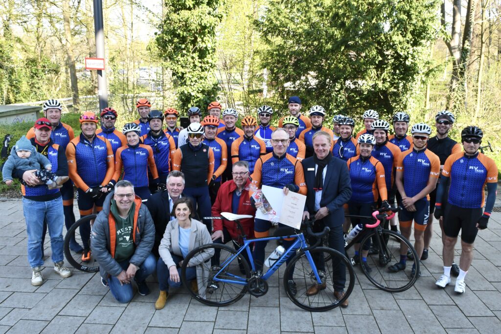 Bildunterschrift: Bei Jürgen Zimmer (vordere Reihe, 3. v. l.) hat sich die Überraschung gelegt, freudig präsentiert er die Urkunde und den Gutschein