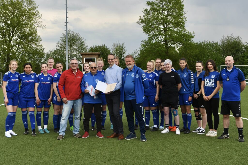 Bildunterschrift: Freudig präsentiert die neue „moin! Vereinsheldin“ Irma Mölck (vordere Reihe, 3. v. l.) die entsprechende Urkunde und den Gutschein