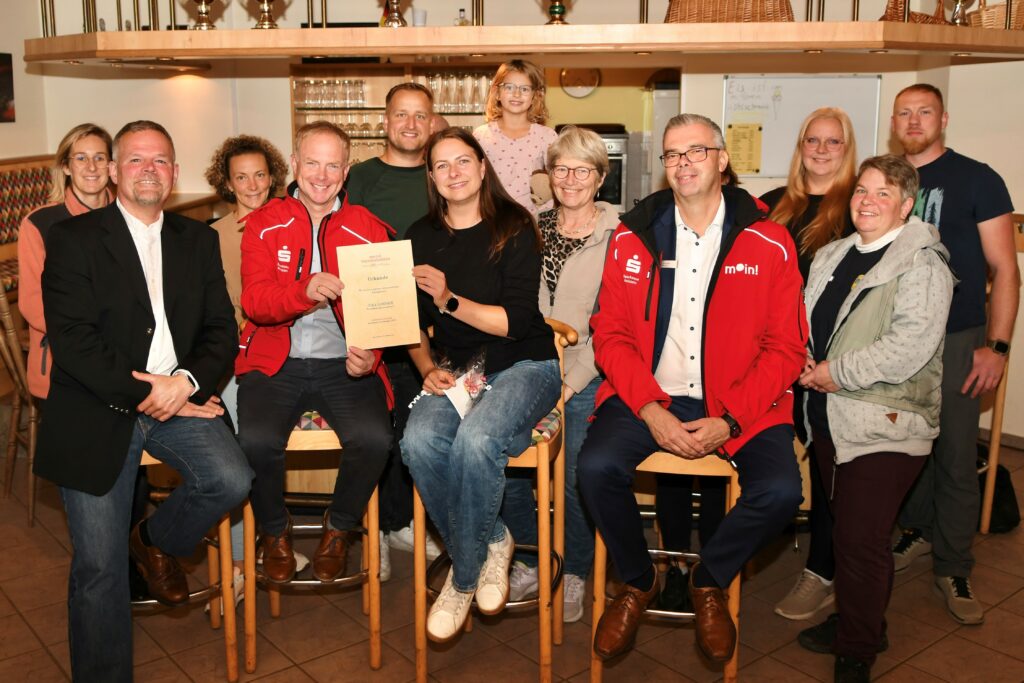Was war geschehen? Eine Gruppe aus Vertretern des Kreissportverbands (KSV) Stormarn, der Sparkasse Holstein und ihren Stiftungen, Familienmitgliedern und Freunden hatten die Brunsbekerin anlässlich einer Vorstandssitzung des Sportvereins überrascht und sie für ihr ehrenamtliches Engagement als „moin! Vereinsheldin“ des Monats September ausgezeichnet.
