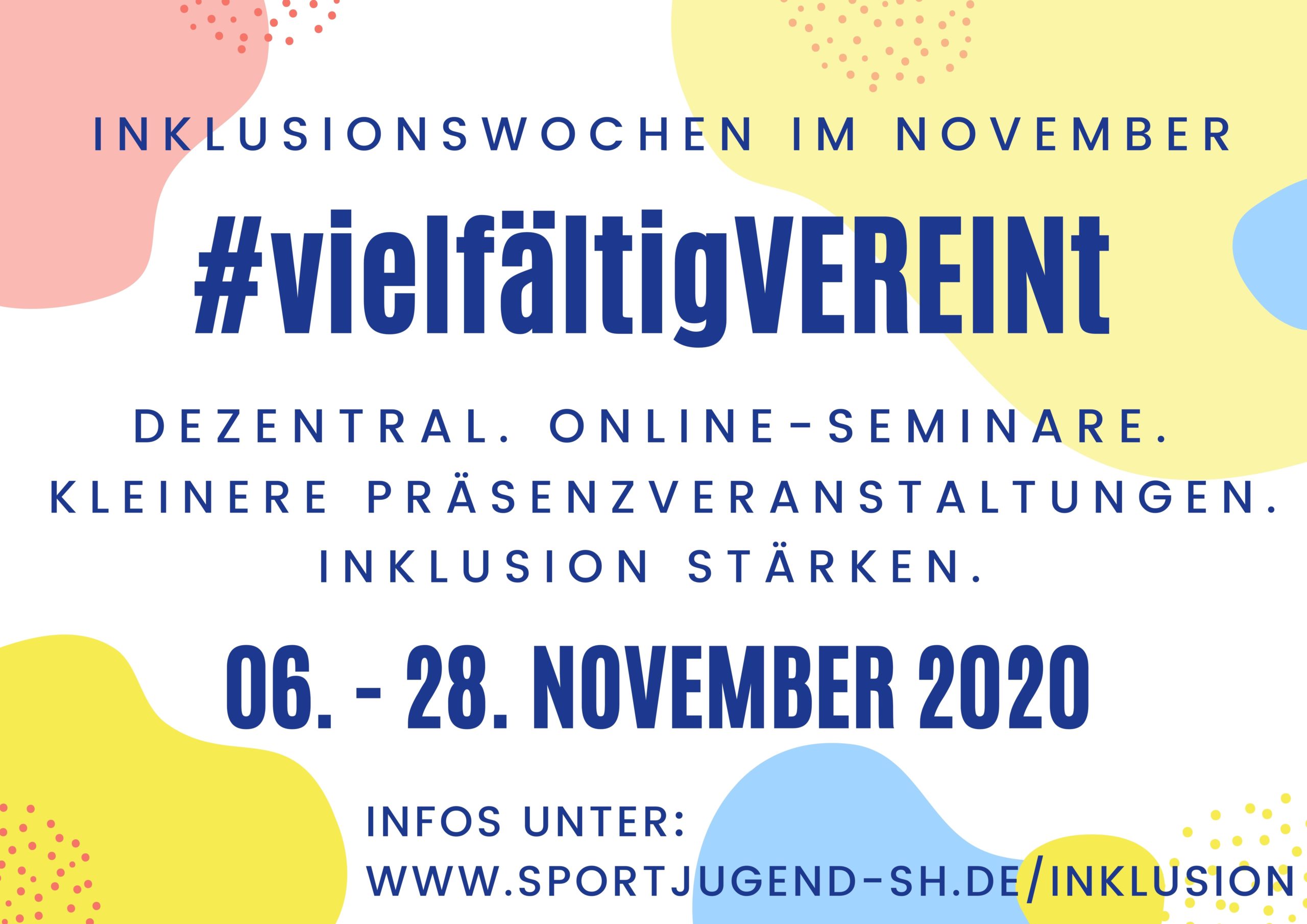 In der Zeit vom 06.11. bis 28.11.2020 möchte die Sportjugend Schleswig-Holstein im Landessportverband (LSV) mit Unterstützung ihrer Mitgliedsvereine und -verbände gemeinsam das Thema Inklusion im Sport sichtbar machen und zeigen, was der organisierte Sport alles rund um das Themengebiet in Schleswig-Holstein auf die Beine stellt.